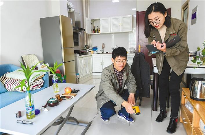 河北省安平縣一家熱力公司員工入戶測量室內(nei) 地暖溫度(2019年11月15日攝)。2018年以來,安平縣利用玉米秸稈等農(nong) 林廢棄物大力推行生物質能源供熱的供暖模式,減少汙染排放,綠色節能型能源走進了千家萬(wan) 戶。 新華社記者 李曉果 攝