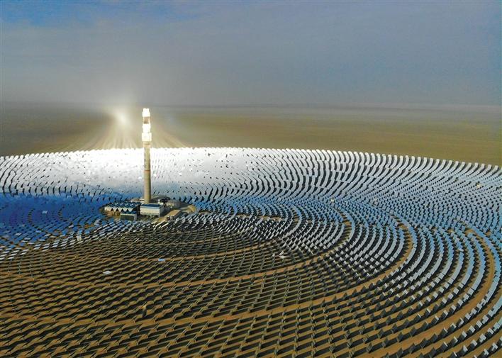 在甘肅省敦煌市向西約20公裏處,被稱為(wei) “超級鏡子發電站”的首航高科敦煌100兆瓦熔鹽塔式光熱電站在戈壁灘上閃耀(2021年2月24日攝,無人機照片)。新華社記者 馬希平 攝