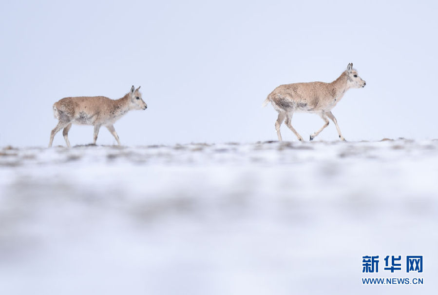 4月20日,兩(liang) 隻藏羚羊向卓乃湖方向行進。新華社記者 吳剛 攝