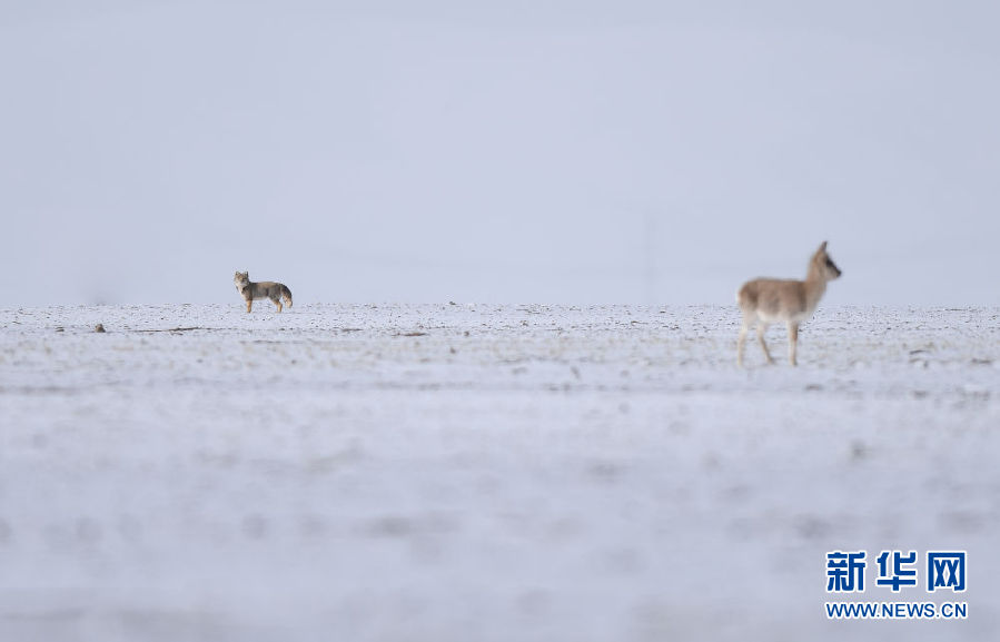 在可可西裏地區拍攝的一隻狐狸(左)和一隻遷徙途中的藏羚羊(4月20日攝)。新華社記者 吳剛 攝