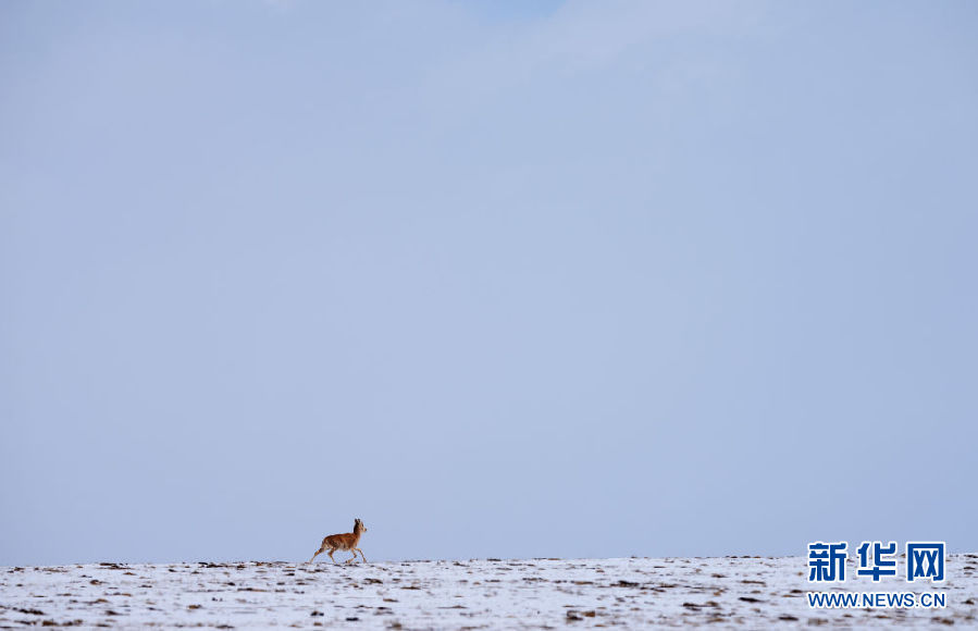 4月20日,一隻藏羚羊向卓乃湖方向行進。新華社記者 費茂華 攝
