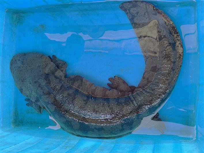到達該店時,水產(chan) 店老板宋保齊正在給“娃娃魚”喂食小魚,這條“娃娃魚”重14斤,長約95厘米。記者向宋先生了解了初遇“娃娃魚”的情況。宋保齊回憶起來還曆曆在目,他說:“清明節的時候,我和朋友們(men) 正在拉薩河曲水段遊玩,意外在岸上發現了它,雖然我是賣水產(chan) 的,但是當時也不能十分確定它是否就是‘娃娃魚’,然後我們(men) 就把它帶回了自家水產(chan) 店飼養(yang) ,在網上查看才確定它就是‘娃娃魚’,也是國家二級保護動物,便聯係相關(guan) 部門,希望能把它放歸大自然。”