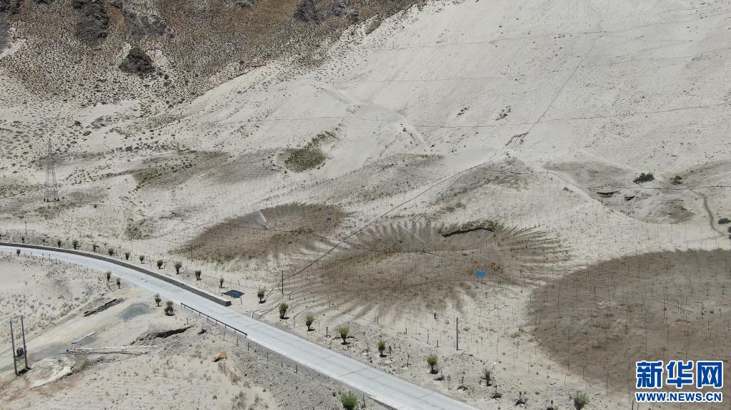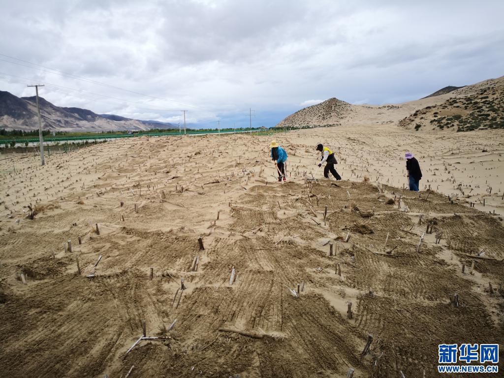 在山南市雅魯藏布江河穀地帶,村民們(men) 在維護固沙用的草方格(2019年7月14日攝)。新華社發(資料照片)