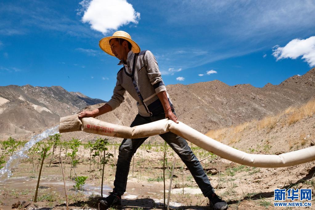 山南市貢嘎縣吉雄鎮劉瓊村村民正在為(wei) 樹苗澆水(6月2日攝)。新華社記者 普布紮西 攝