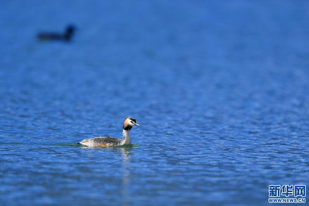 6月14日在拉魯濕地拍攝的鳳頭䴙䴘。新華社記者 張汝鋒 攝
