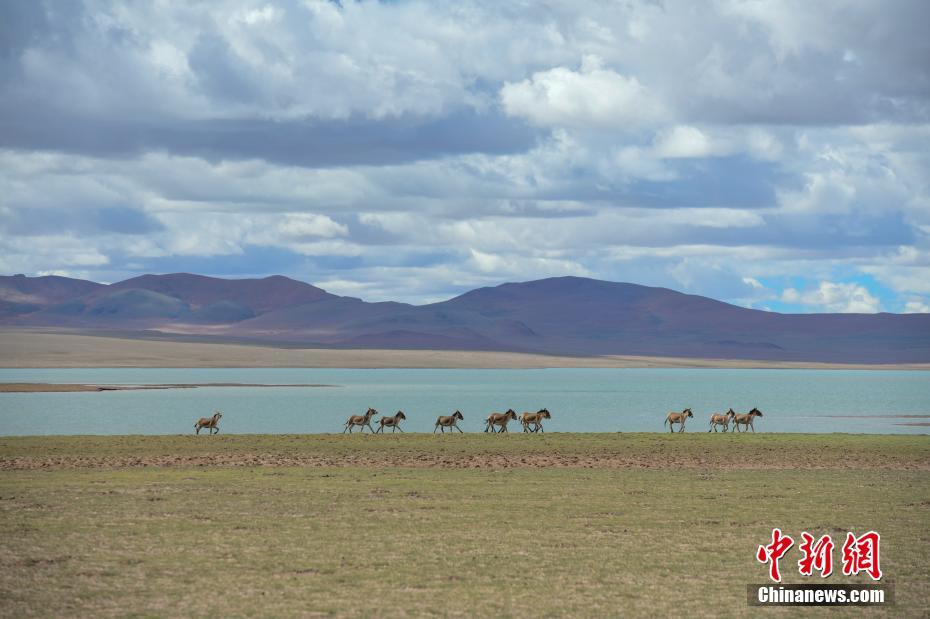 6月19日,西藏那曲羌塘草原上的藏野驢在湖邊奔騰跳躍。羌塘草原位於(yu) 西藏自治區北部,平均海拔超過4600米,是目前中國海拔最高、麵積最大的自然保護區。這裏是野生動物的樂(le) 園,藏羚羊、藏原羚、藏野驢等珍稀野生動物與(yu) 雪山、草地、藍天、白雲(yun) ,構成撼人心魄的壯美畫麵。 中新社記者 貢嘎來鬆 攝