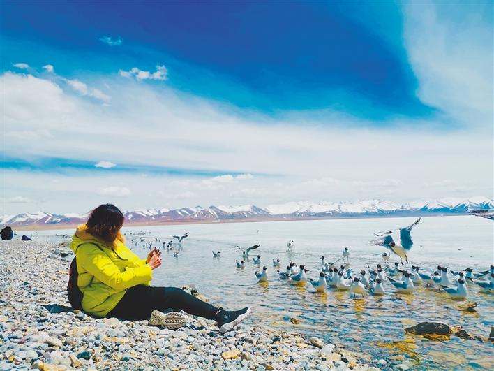 圖為(wei) 遊客在納木錯邊拍攝紅嘴鷗。 記者 央金 攝