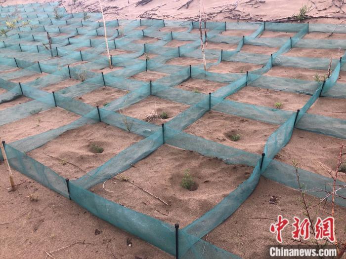 “傳(chuan) 統的方法是用廢樹枝等擺成方格等一定的形狀壓沙,裏麵再種上植物,效果很好但樹枝往往四五年就腐爛了;最近我們(men) 在嚐試推廣一種新型化學材料方格,成規模快,且能維持七到十年。”中國科學院西北生態資源研究院研究員常學向對記者說。