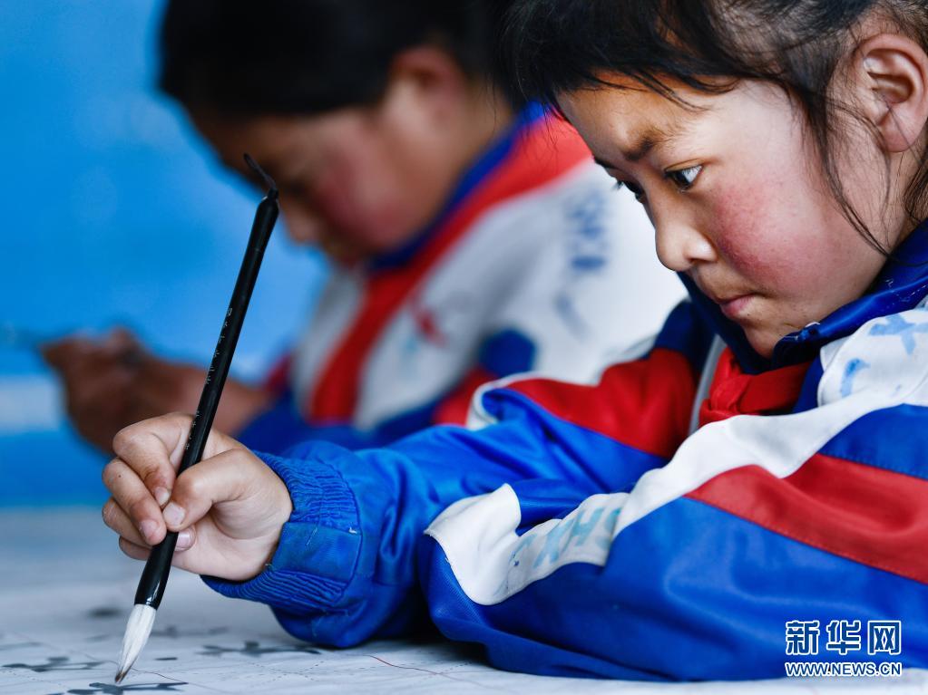 在玉樹藏族自治州紅旗小學,學生在上書(shu) 法課(3月19日攝)。新華社記者 張龍 攝