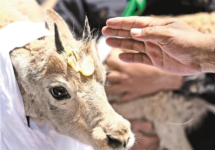 7月7日,在可可西裏索南達傑保護站野生動物救助中心,三公兩母共五隻人工救助的藏羚羊被放歸大自然。圖為7月7日,在可可西裏索南達傑保護站野生動物救助中心,可可西裏巡山隊員按照風俗,在藏羚羊額頭上塗抹酥油表達祝福。[詳細]