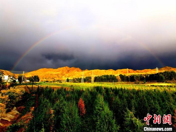 2019年月初,甘肅張掖市肅南裕固族自治縣祁連山下草原千裏花開、萬(wan) 裏綠海。圖為(wei) 雨後彩虹。(資料圖) 武雪峰 攝