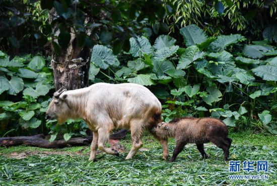 圖為(wei) 金毛羚牛寶寶追著媽媽吃奶 新華社記者劉大偉(wei) 攝