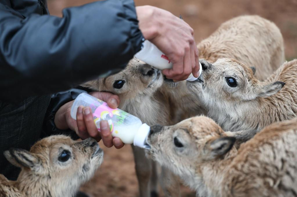 2020年7月7日,三江源國家公園管理局長江源園區可可西裏管理處卓乃湖保護站的工作人員在給藏羚羊幼仔喂奶。新華社記者 薛玉斌 攝