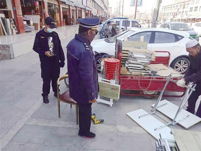 執法人員對占道經營商戶進行勸說。圖由城關(guan) 區城管局提供