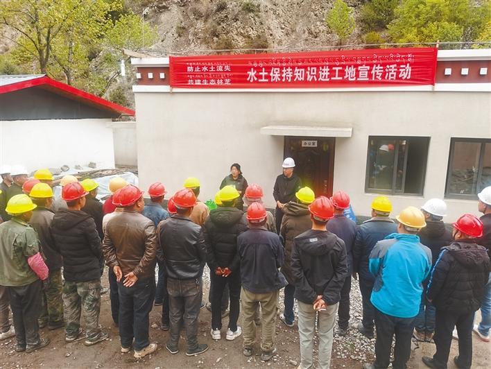 林芝市水利局工作人員在朗縣拉多鄉項目工地向一線工人和管理人員宣傳水土保持知識