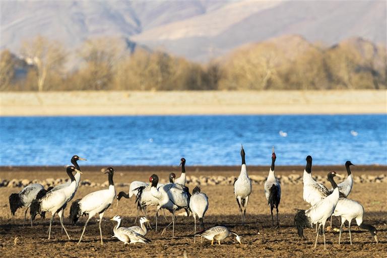隨著西藏不斷加大黑頸鶴棲息地保護力度,黑頸鶴的生存環境進一步改善。每年十月中下旬,大批黑頸鶴從(cong) 藏北高原飛到拉薩河穀,它們(men) 在農(nong) 田、沼澤地裏覓食嬉戲,享受冬日暖陽。