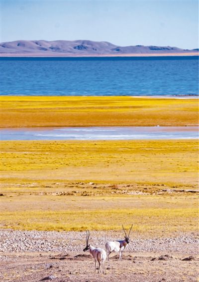 圖為(wei) 藏羚羊在位於(yu) 西藏那曲市的色林錯湖畔。