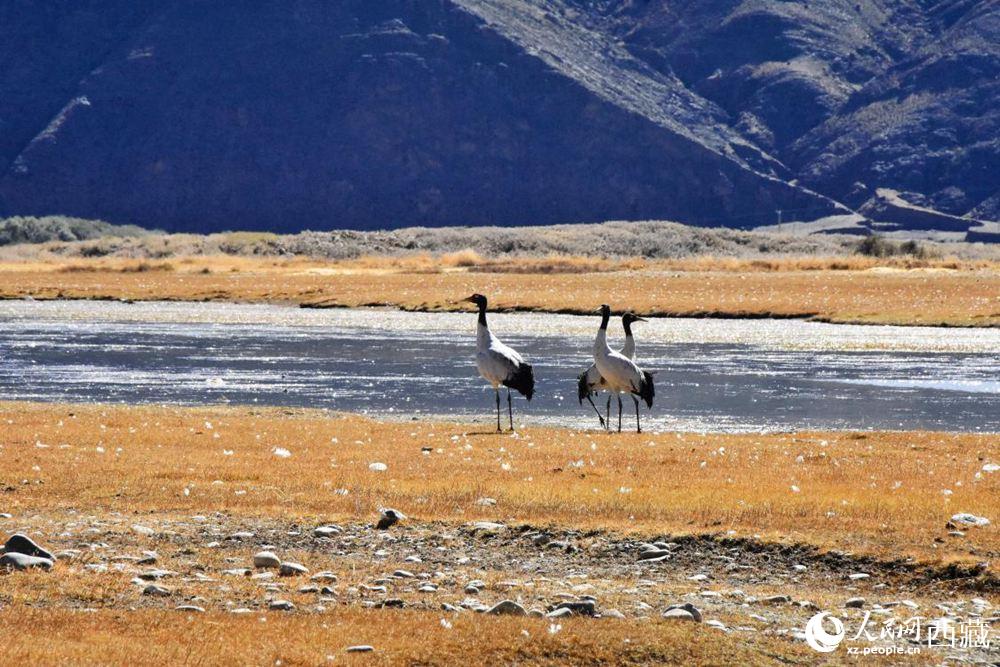 黑頸鶴在收割完的青稞地。人民網 李海霞 攝