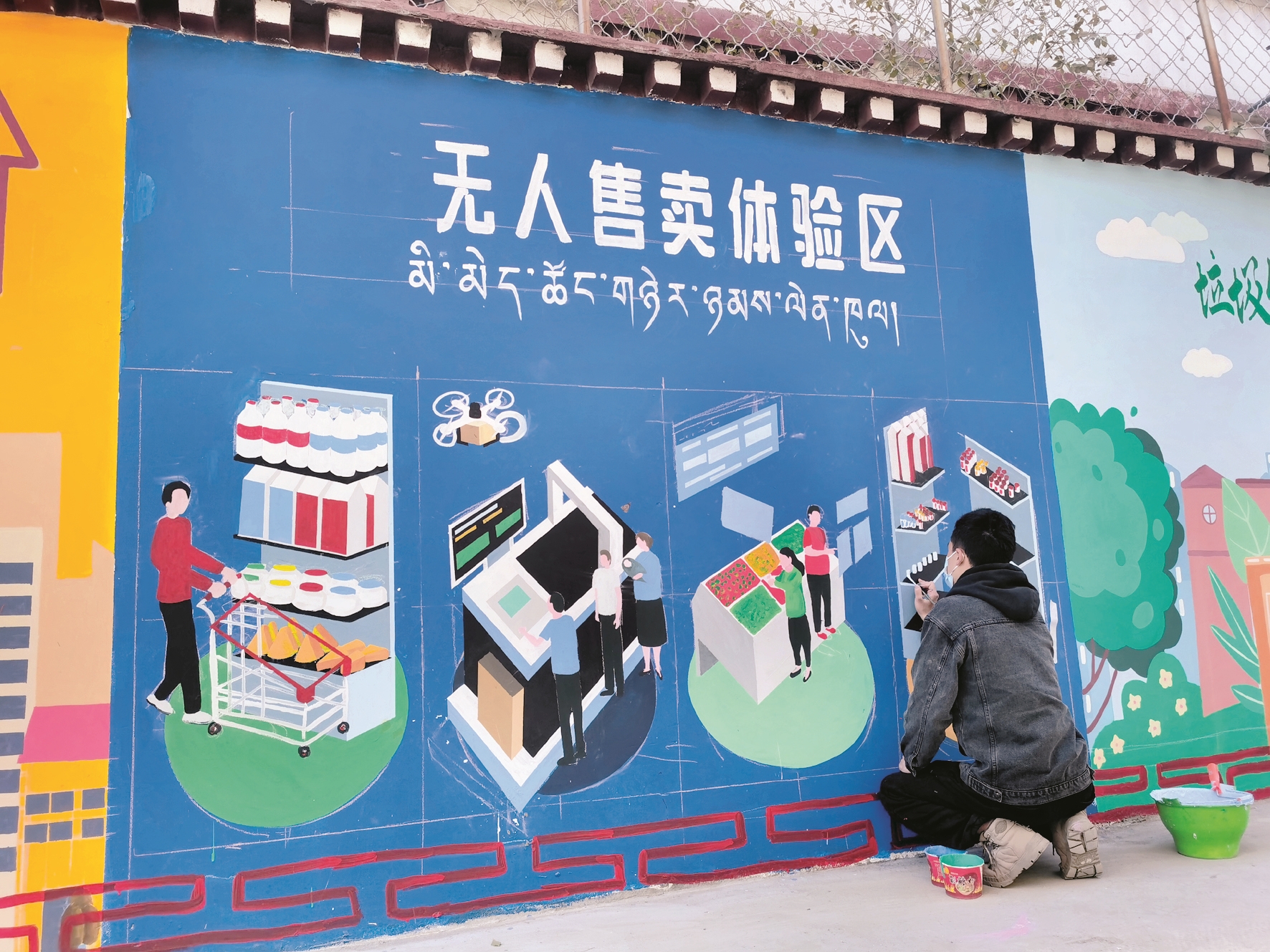 圖為(wei) 工作人員正在對繞賽社區哈達巷進行牆繪。拉薩融媒記者 範江英攝