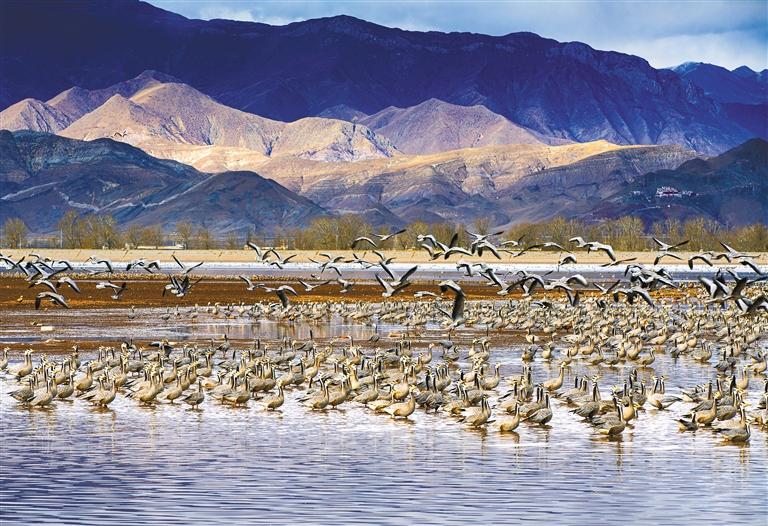 圖為(wei) 在拉薩河穀越冬棲息的斑頭雁群落。記者 格桑吉美 攝