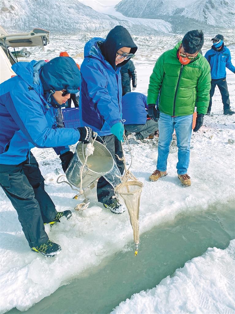 為(wei) 全麵係統摸清水質狀況,監測組在崗加曲巴冰川末端融水河流斷麵開展了水溫、電導率、溶解氧、PH值的現場監測,同時開展了微塑料、抗生素等指標的全分析及生態監測的采樣工作。