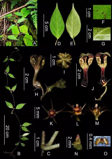 2021年7月中旬至8月初,由西雙版納植物園星耀武研究員率隊的聯合考察隊,對西藏日喀則地區喜馬拉雅南坡的維管植物進行了考察和標本采集。考察人員在吉隆縣薩勒鄉(xiang) 發現一種正處於(yu) 盛花期的吊燈花屬未知植物。通過解剖拍照、文獻查閱及相似種的模式標本核對後,最終確認為(wei) 一新種。根據其模式產(chan) 地,將其命名為(wei) 吉隆吊燈花(Ceropegia jilongensis)。