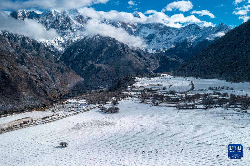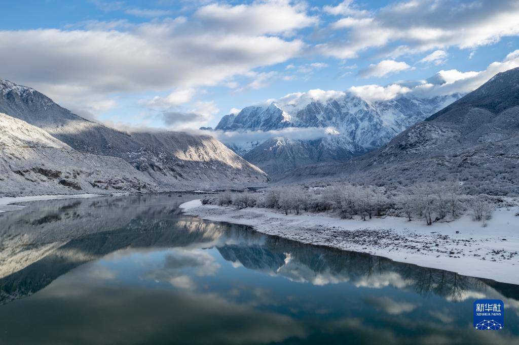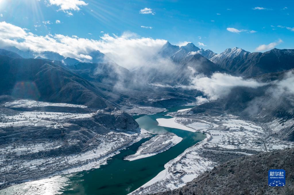 當日,西藏林芝市米林縣派鎮雅魯藏布大峽穀附近普降瑞雪,銀裝素裹的雅魯藏布江和南迦巴瓦峰顯得格外壯美。
