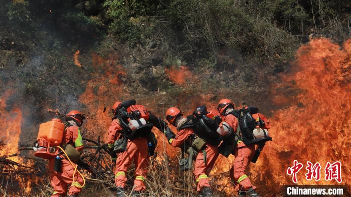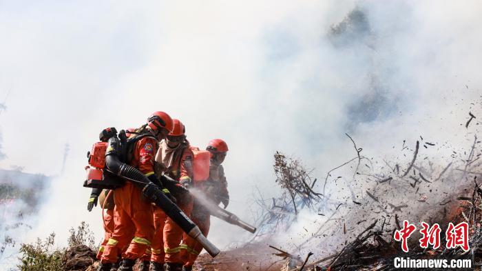 圖為(wei) 3月2日,雲(yun) 南森林草原火災應急處置聯合實戰演練中常規裝備滅火。 雲(yun) 南省森林消防總隊 攝