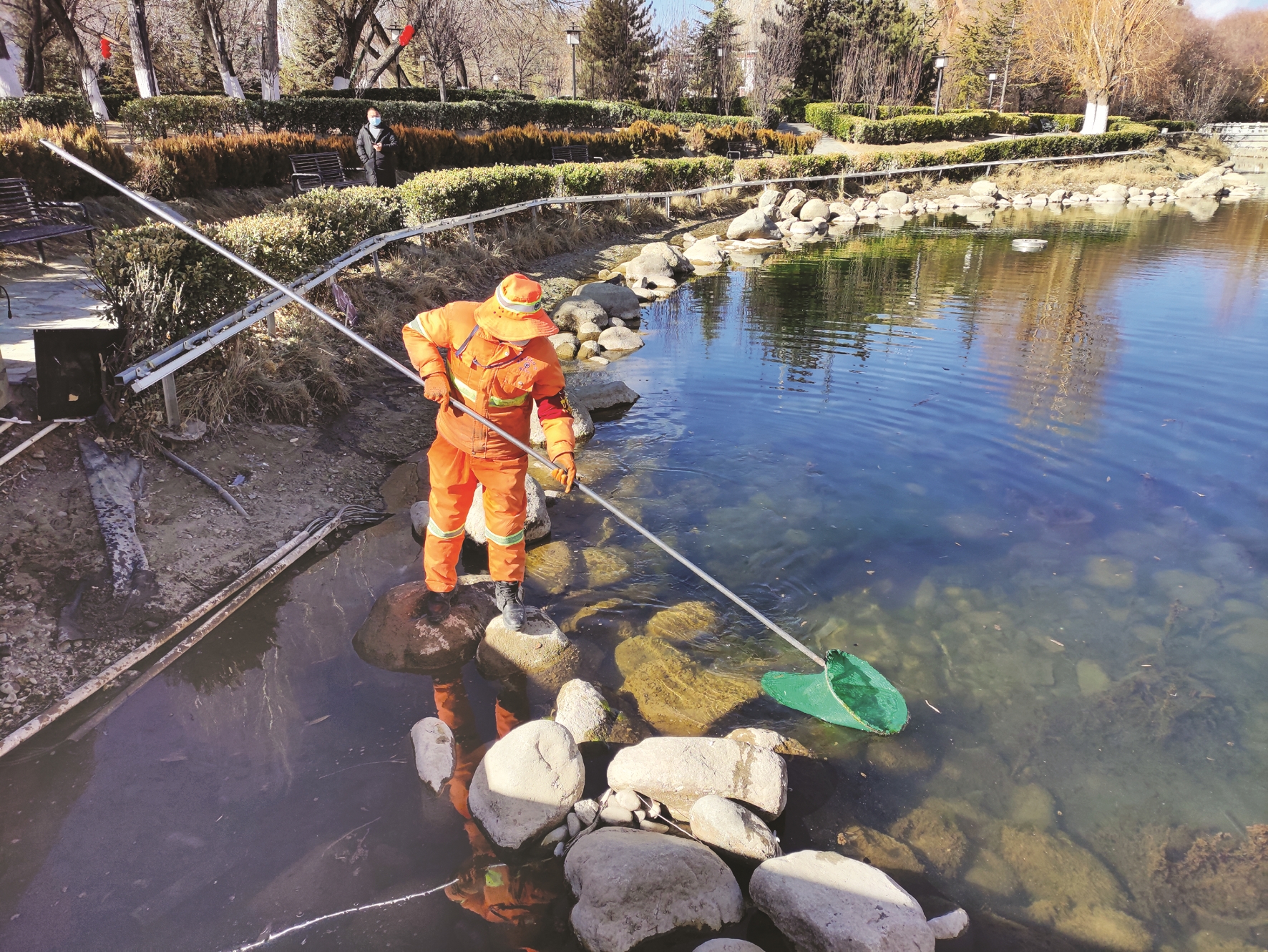 圖為(wei) 布達拉宮廣場管理處工作人員手持長柄網兜打撈水裏的垃圾。拉薩融媒記者 趙耀鐵攝