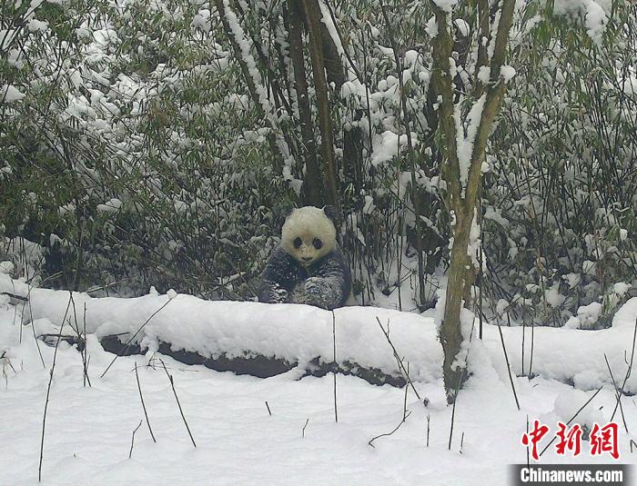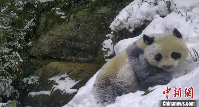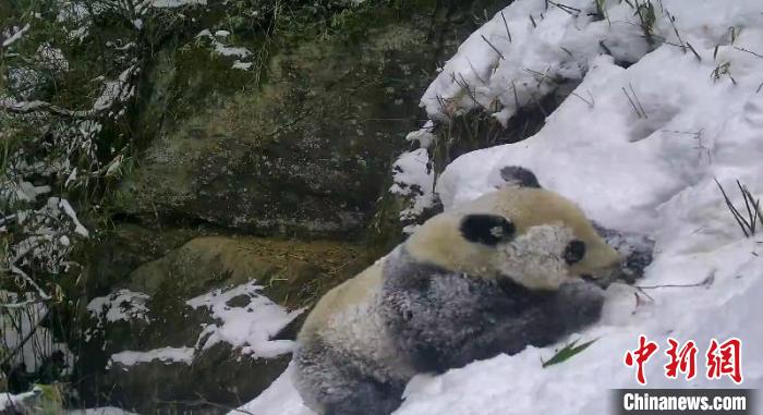 四川平武拍攝到野生大熊貓雪地撒歡畫麵