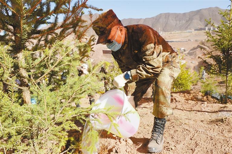 “挖坑、栽樹、修圍堰、立支架、澆水,這是植樹的五個(ge) 步驟,植樹過程中最關(guan) 鍵的是樹苗移植後的培土與(yu) 澆水……”出發前,昌都軍(jun) 分區宣傳(chuan) 保衛科科長羅兵為(wei) 官兵們(men) 詳細講解了植樹的要領。
