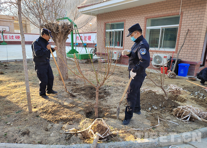 勞動中,該執勤點民警積極參與(yu) ,從(cong) 挖坑到樹苗的排列、扶正、培土、踩實、澆水各個(ge) 環節分工到位,呈現出一派熱火朝天的植樹景象。
