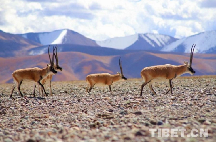 圖為(wei) 那曲市境內(nei) 雪山下正在遷徙的藏羚羊 攝影:王魯鎮