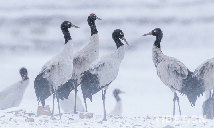圖為(wei) 在拉薩市林周縣虎頭山水庫附近越冬的黑頸鶴無憂無慮地覓食 攝影:趙耀