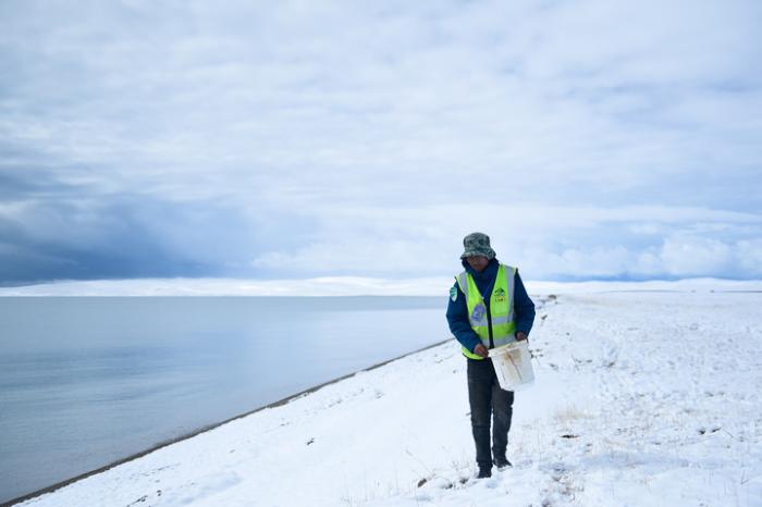 2021年10月,三江源國家公園黃河源園區生態管護員俄措在紮陵湖邊撿拾垃圾。新華社記者張龍攝