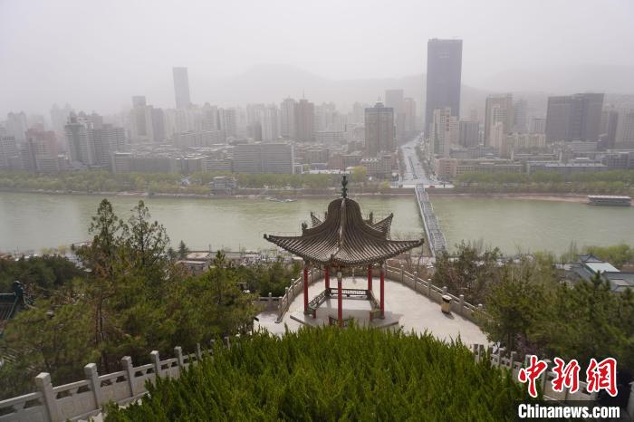 圖為(wei) 3月24日,從(cong) 蘭(lan) 州市白塔山上,眺望被沙塵籠罩的黃河對岸城區。 九美旦增 攝