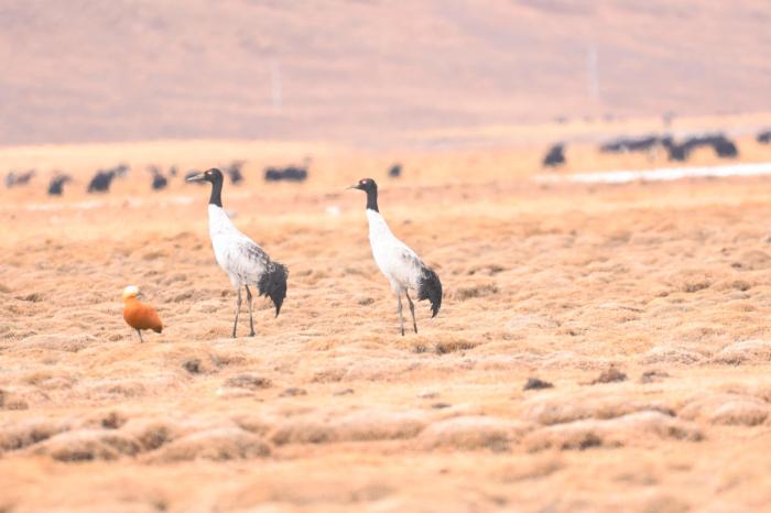 圖為(wei) 黑頸鶴與(yu) 灰鶴。 青海多美生態環保科技有限公司 供圖
