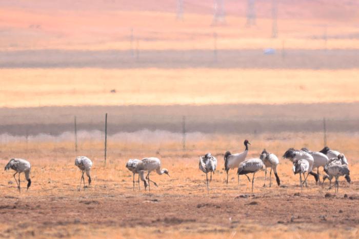 4月24日,在青海湖北岸的青海省海北藏族自治州剛察縣,攝影愛好者在該縣哈爾蓋鎮田間拍攝到成群黑頸鶴。黑頸鶴是全球十五種鶴類中唯一在高原繁殖和棲息的鶴類。[詳細]