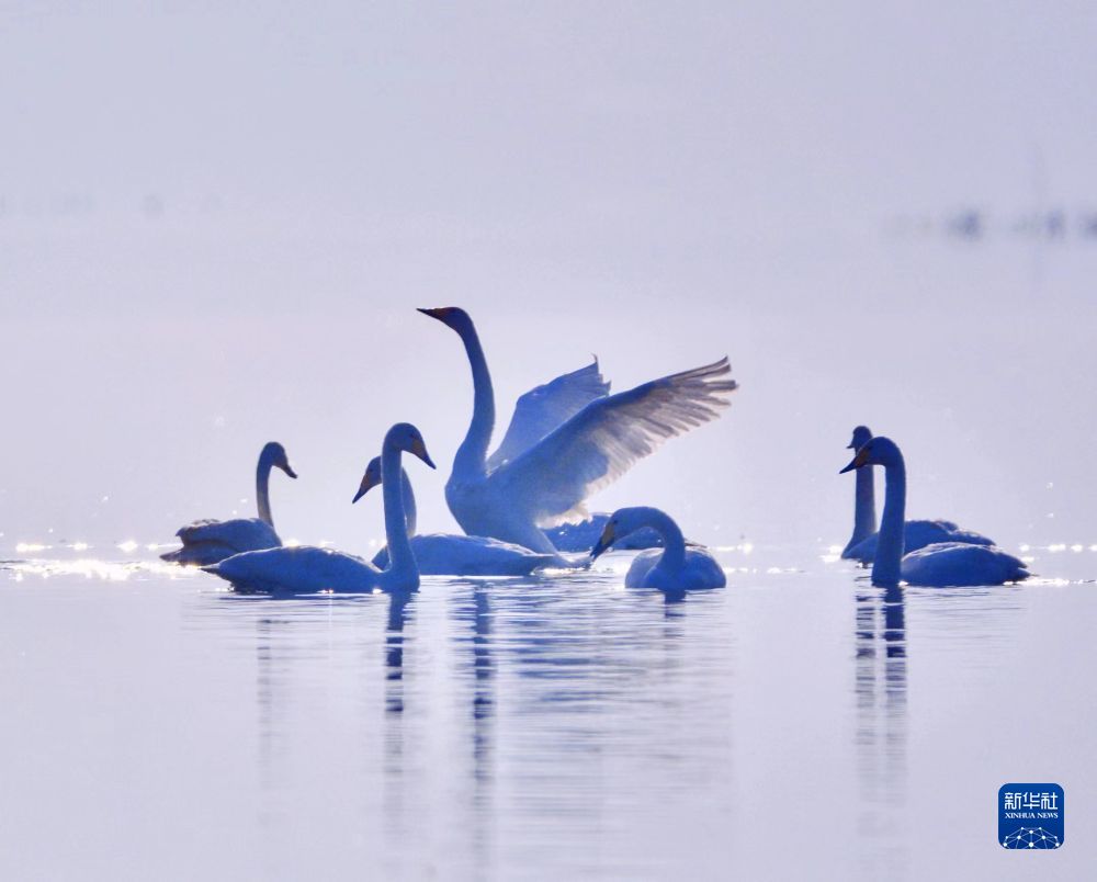 2021年11月23日在青海省海東(dong) 市化隆回族自治縣境內(nei) 的黃河濕地拍攝的大天鵝。新華社發 李玉峰 攝