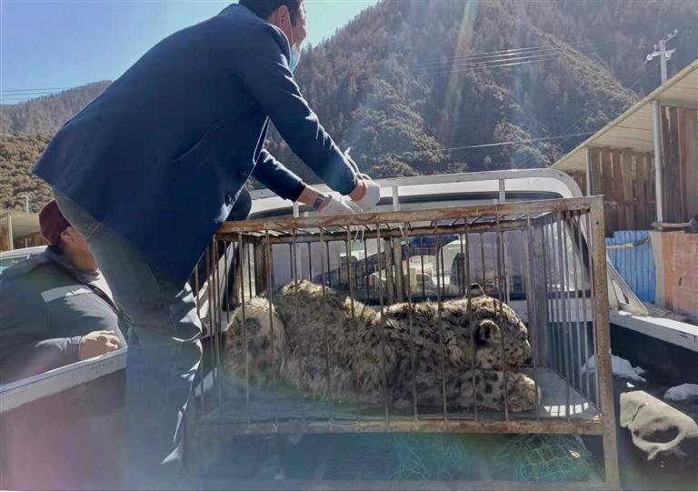 圖為(wei) 工作人員將雪豹運送至林芝市野生動物收容救護站。 (西藏自治區林業(ye) 和草原局提供)
