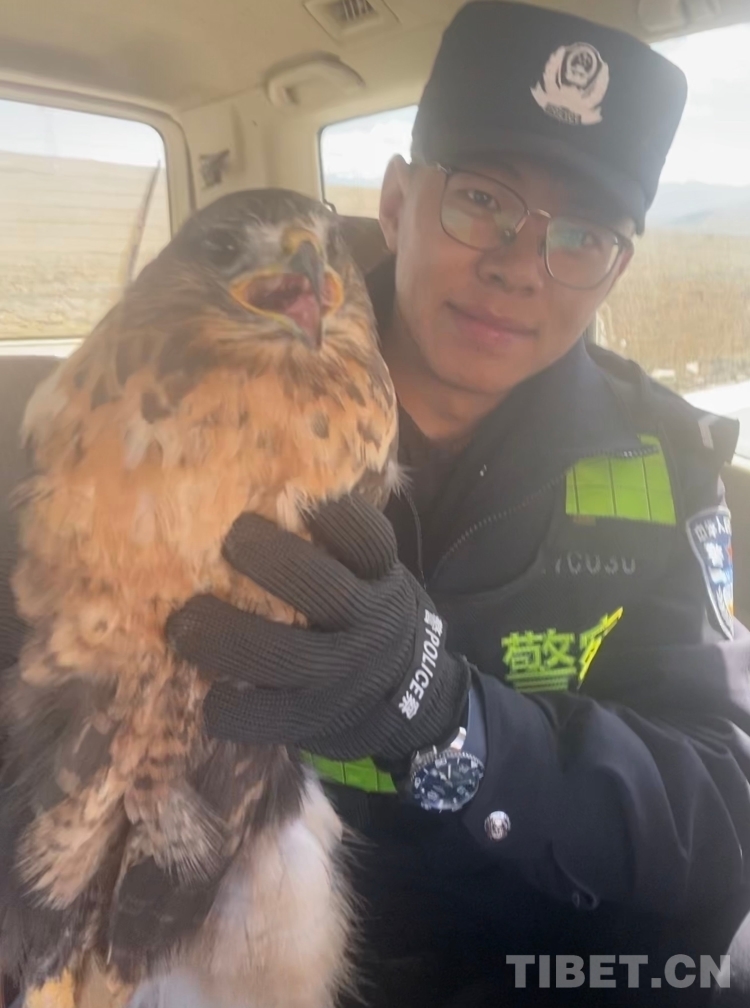 圖為(wei) 民警與(yu) 被救助的成年金雕 攝影:旦增多吉