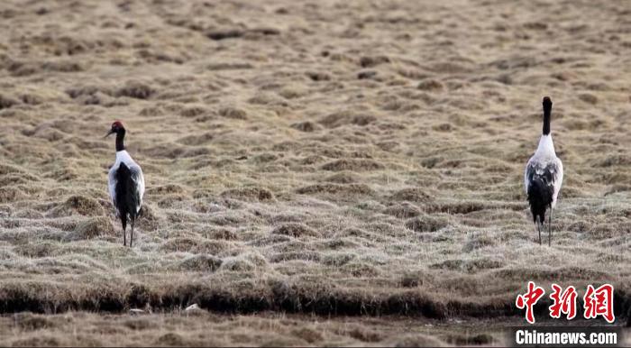 圖為(wei) 兩(liang) 隻黑頸鶴在濕地中漫步。 天峻縣融媒體(ti) 中心 供圖