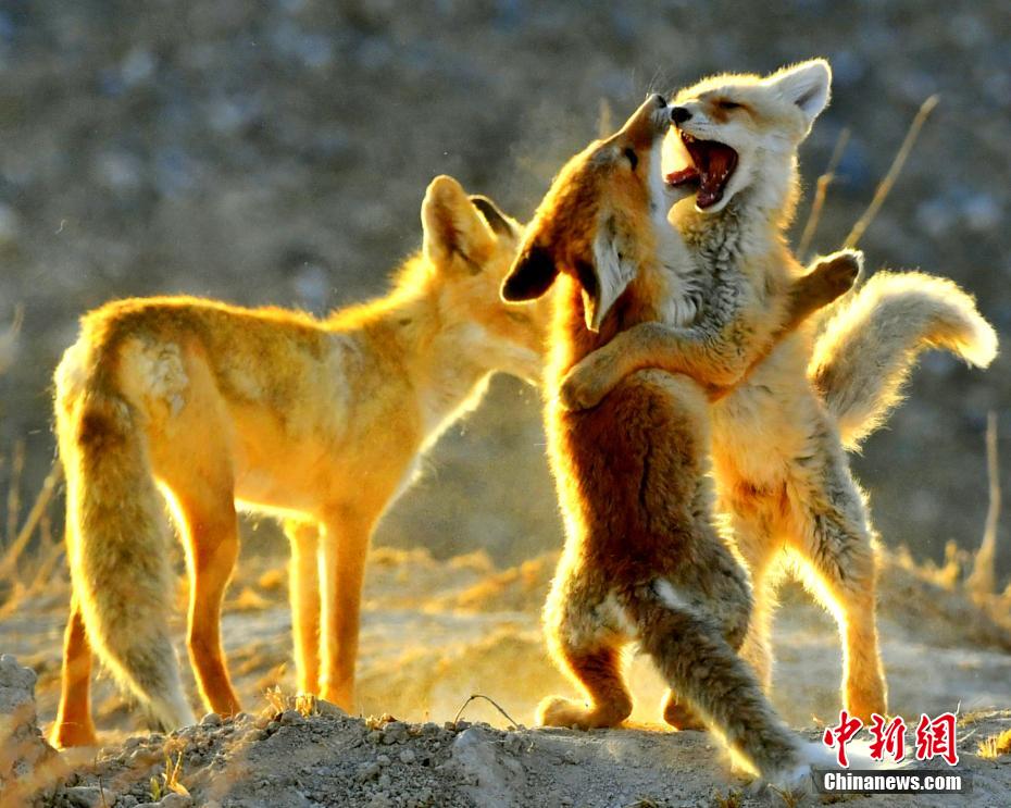 連日來,每到傍晚,在中國“鹽湖城”青海省格爾木河畔的濕地,多隻赤狐在濕地嬉戲玩耍。宗布爾 攝
