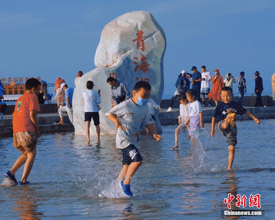 圖為(wei) 遊客在青海湖畔水中玩耍。馬銘言 攝