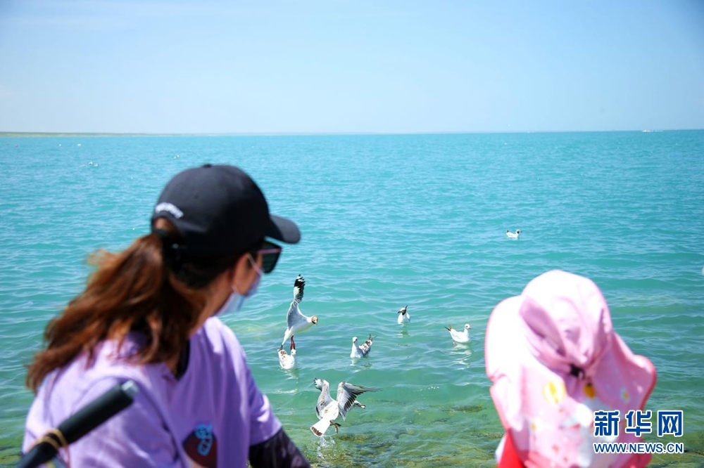 8月8日,遊客在青海湖畔觀鳥賞魚。新華網 馬洪婷 攝