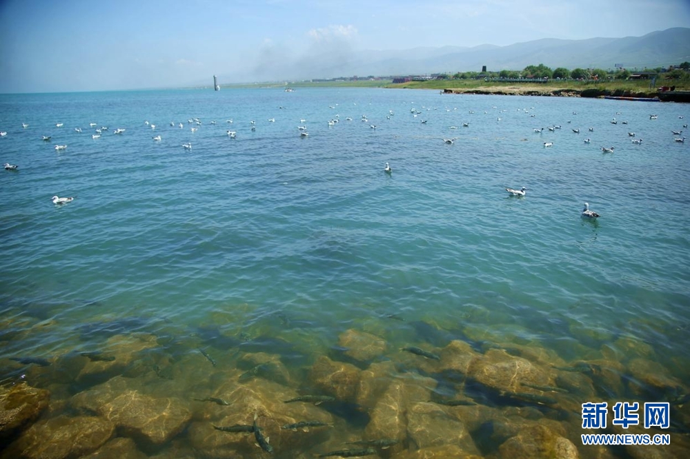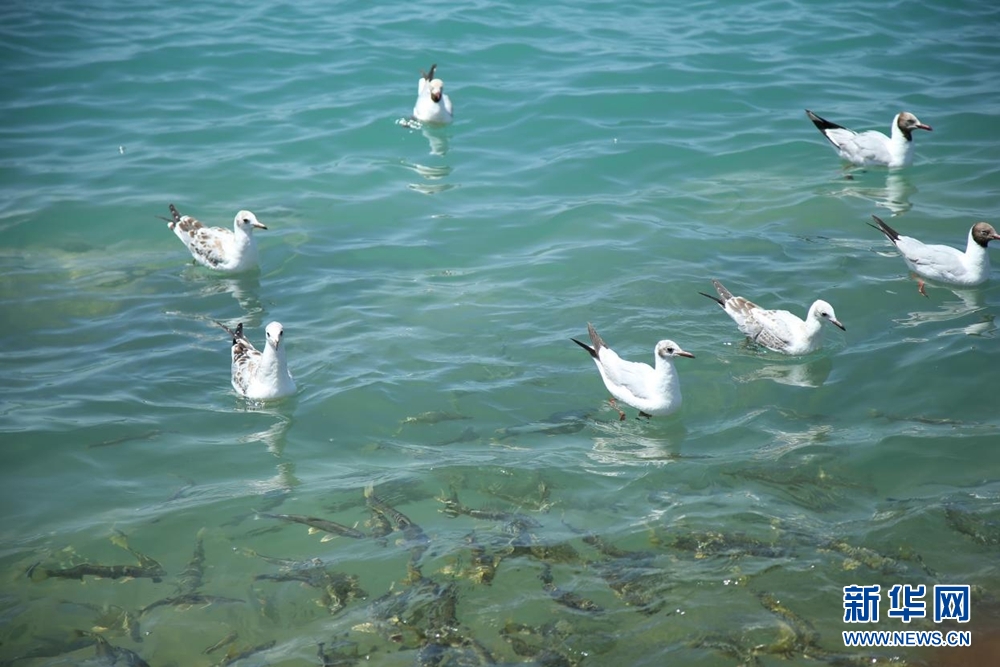 水麵上,棕頭鷗隨波蕩漾;湖水裏,青海湖裸鯉悠閑遊弋。新華網 馬洪婷 攝