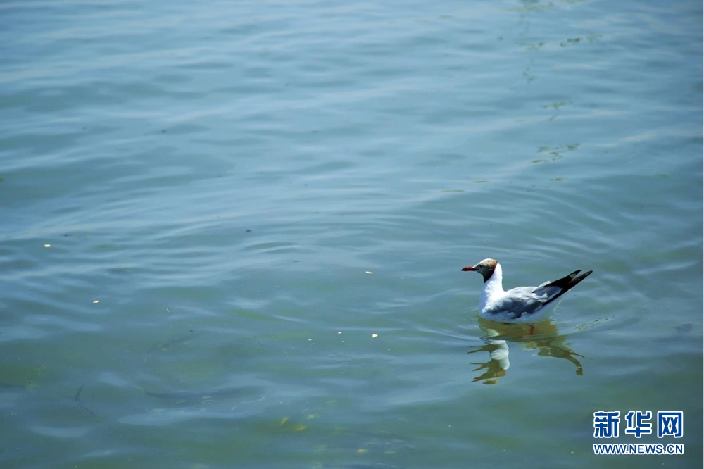 一隻棕頭鷗在湖麵遊弋。新華網 馬洪婷 攝