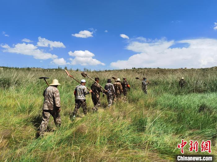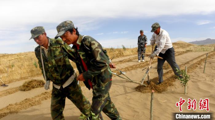 資料圖為(wei) 固沙工程人工運草。 烏(wu) 蘭(lan) 縣委宣傳(chuan) 部供圖