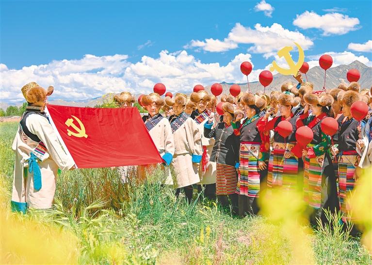 圖為(wei) 黨(dang) 的光輝照邊疆、邊疆人民心向黨(dang) 。各族群眾(zhong) 以淳樸而熱烈的形式表達自己的愛黨(dang) 愛國情感。圖為(wei) 2021年7月1日,西藏自治區貢嘎縣黨(dang) 員開展慶祝中國共產(chan) 黨(dang) 成立100周年“永遠跟黨(dang) 走”主題黨(dang) 日活動。