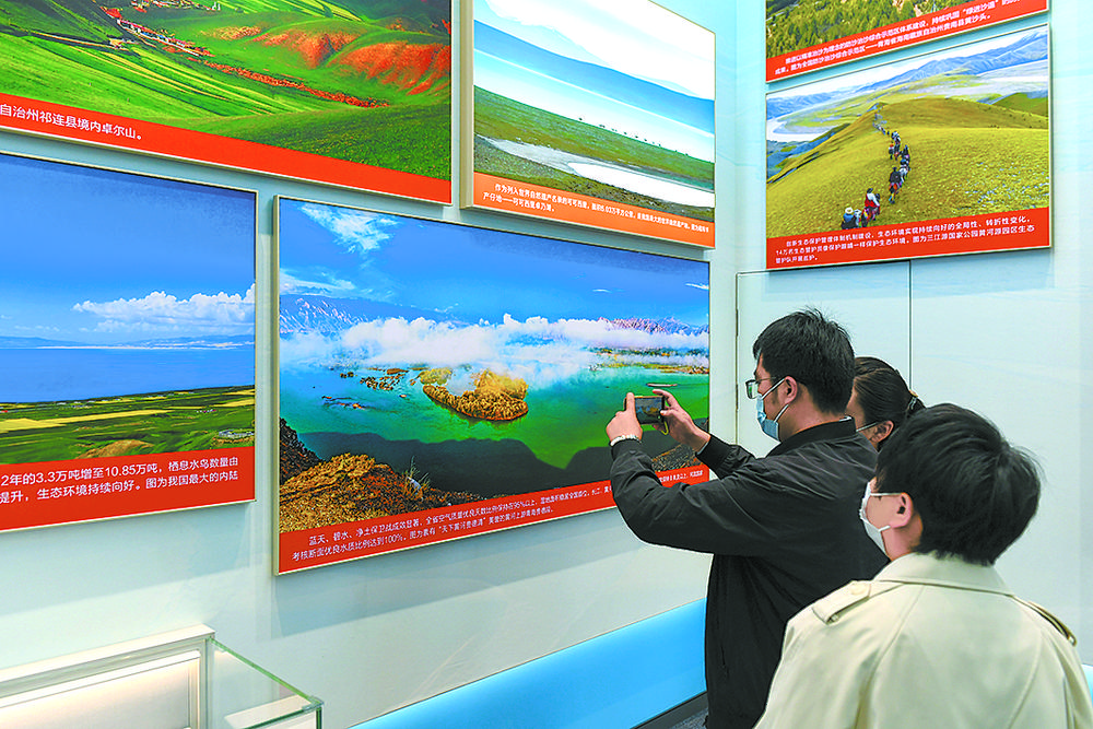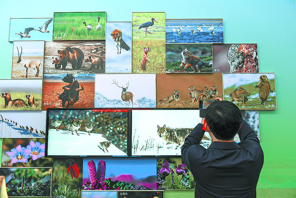 觀眾(zhong) 駐足觀看青海特有的動植物照片。
